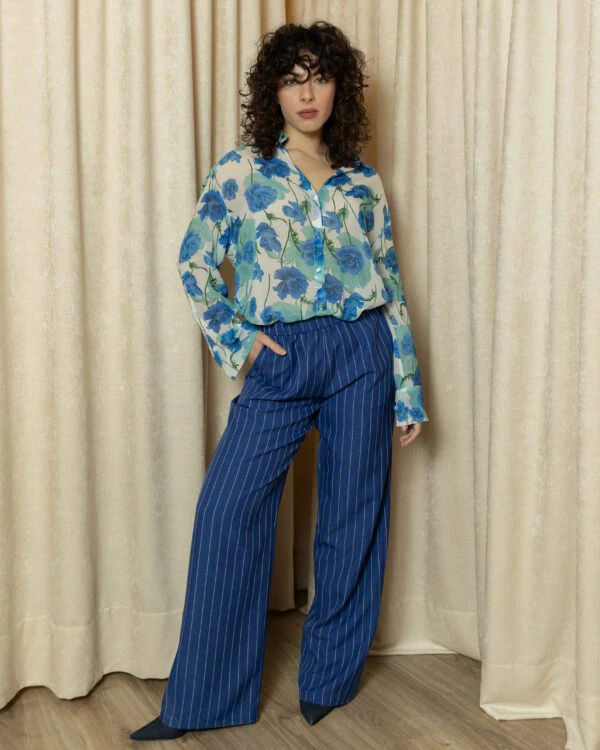 Ημιδιάφανο πουκάμισο με το exclusive Anastasia Fakli print σε αποχρώσεις του μπλε και της γης. Limited edition σχέδιο, ελληνικής κατασκευής από μείγμα βισκόζης και μεταξιού. Oversized γραμμή με ντυμένα κουμπιά από το ίδιο ύφασμα.