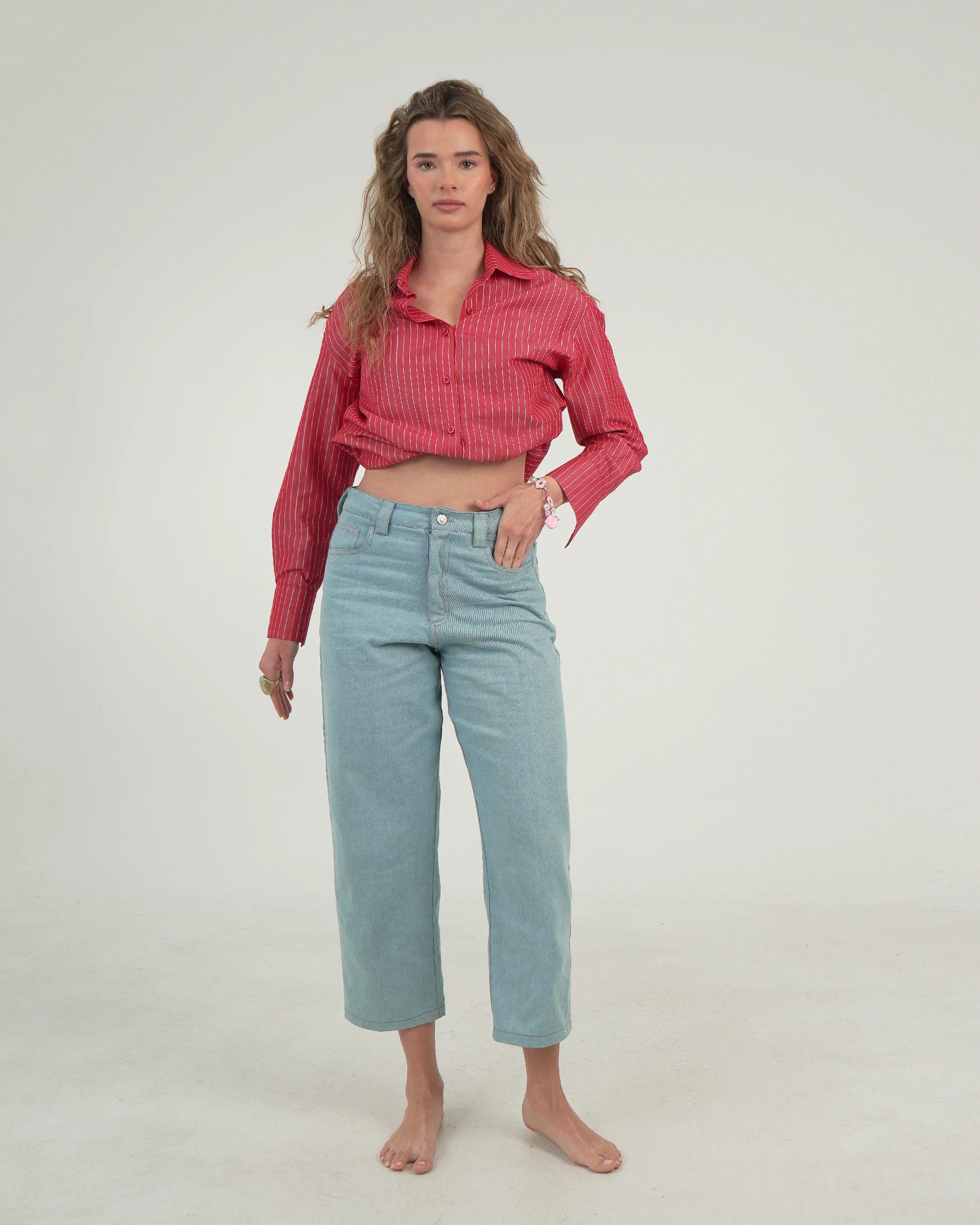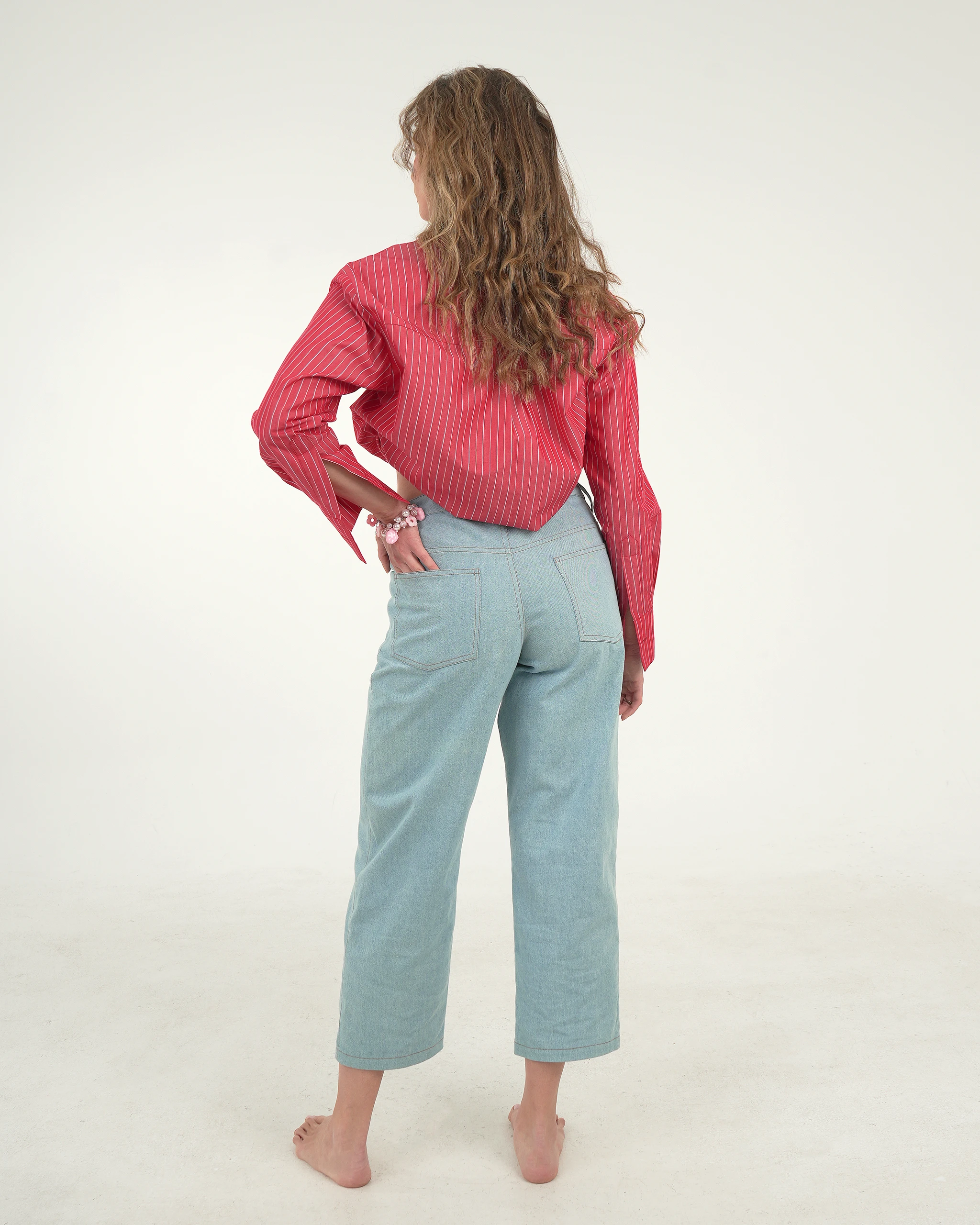 Light blue denim από 100% βαμβάκι με relaxed γραμμή και εσωτερικό ρυθμιζόμενο λάστιχο στη μέση για απόλυτο έλεγχο στο fit.