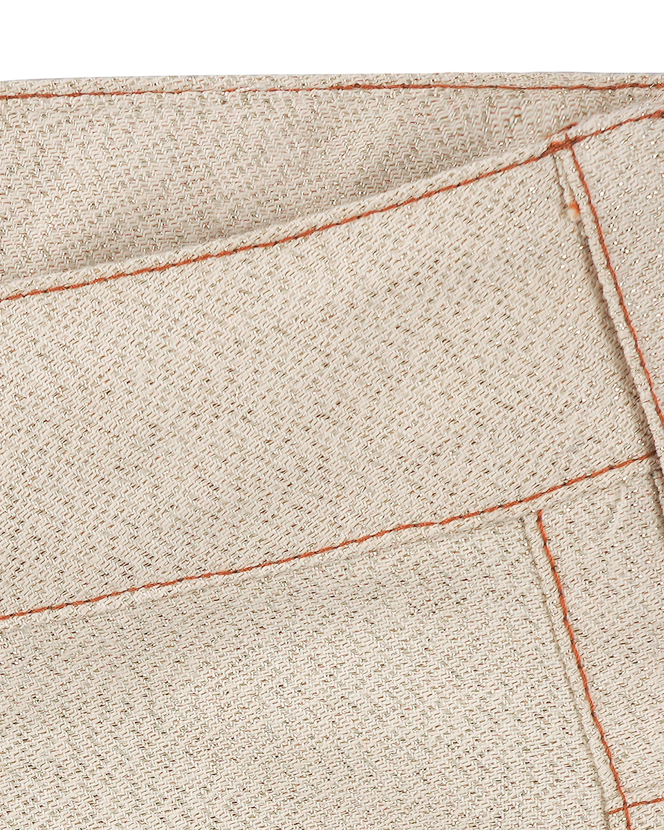 Σε μπεζ απόχρωση με λεπτές χρυσές ίνες μέσα στο ύφασμα, δημιουργεί ένα αποτέλεσμα που φωτίζει διακριτικά το look χωρίς υπερβολές. Η καθαρή, straight γραμμή του προσφέρει άνεση και κομψότητα, ενώ το εσωτερικό ρυθμιζόμενο λάστιχο στη μέση επιτρέπει να προσαρμόζεις την εφαρμογή ανάλογα με το πώς θέλεις να σταθεί το παντελόνι στο σώμα.
