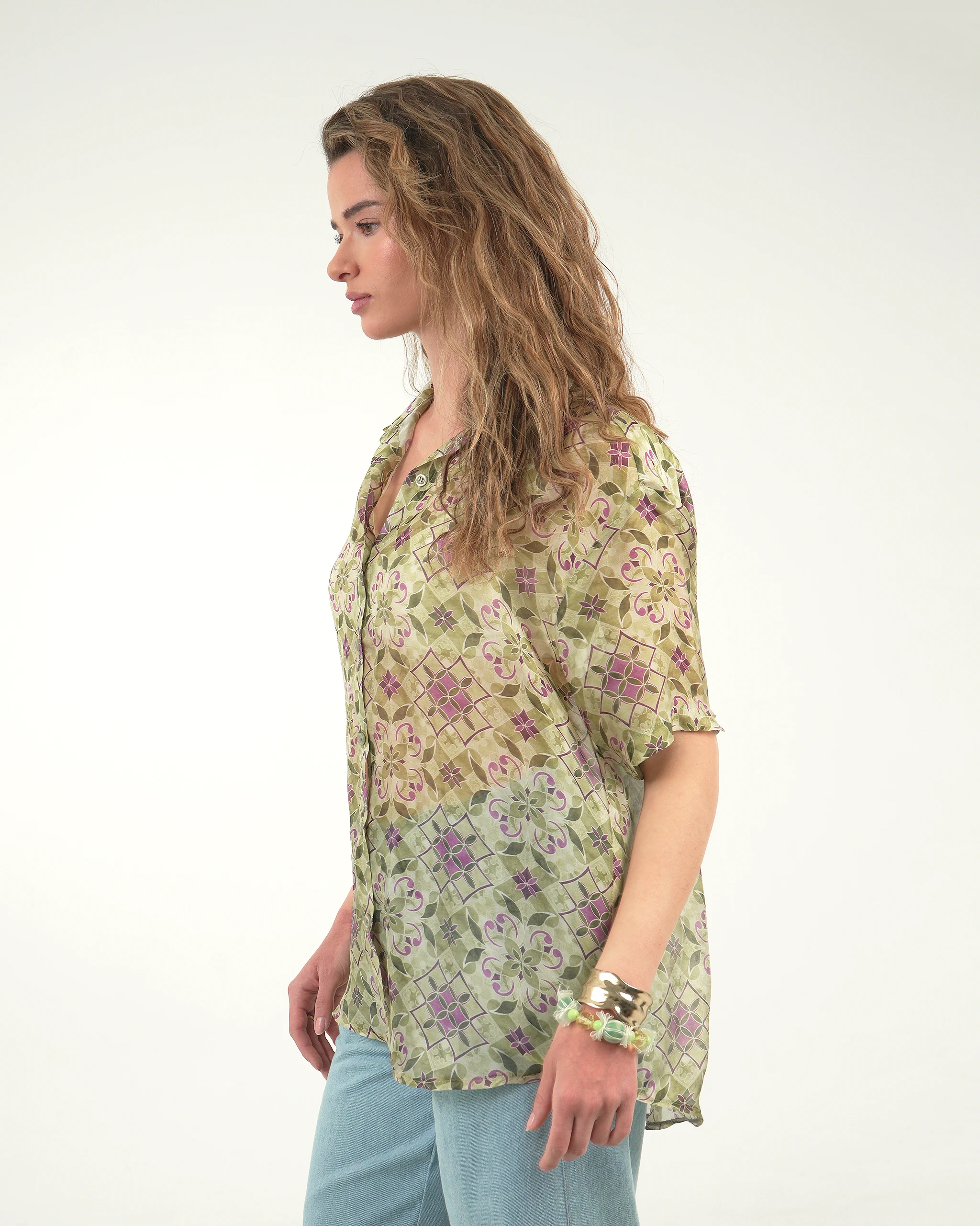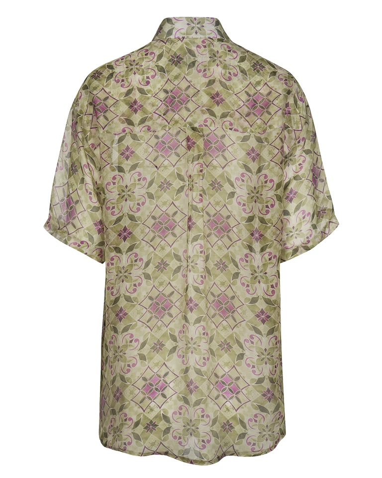 Ημιδιάφανο πουκάμισο από φυσικό ύφασμα με μεταξένια υφή και μοναδικό print σχεδιασμένο in-house από την Anastasia Fakli.