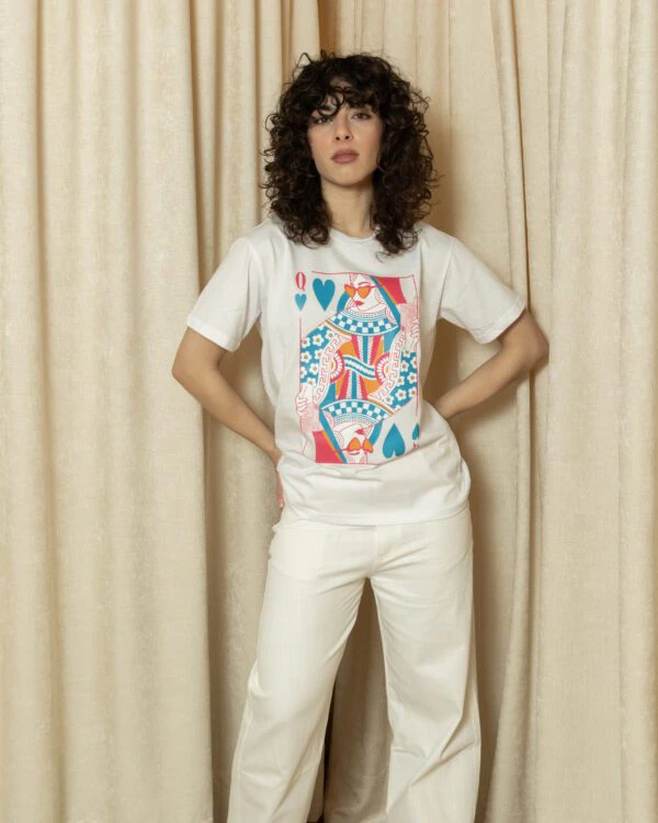 T-shirt από 100% βαμβάκι με bold, παιχνιδιάρικο print εμπνευσμένο από τη φιγούρα της ντάμας – ανατρεπτική, στιλάτη και γεμάτη αυτοπεποίθηση.