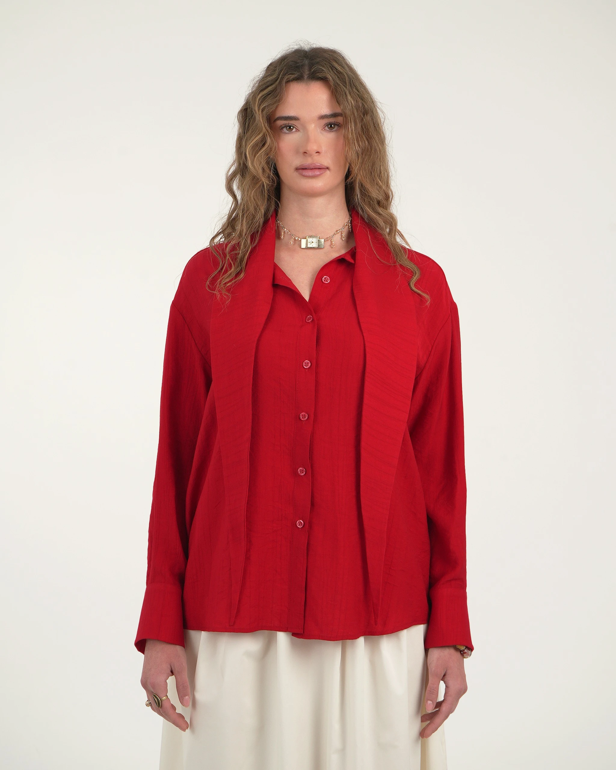 Κομψό κόκκινο πουκάμισο με ιδιαίτερο γιακά που δένεται σε φιόγκο.