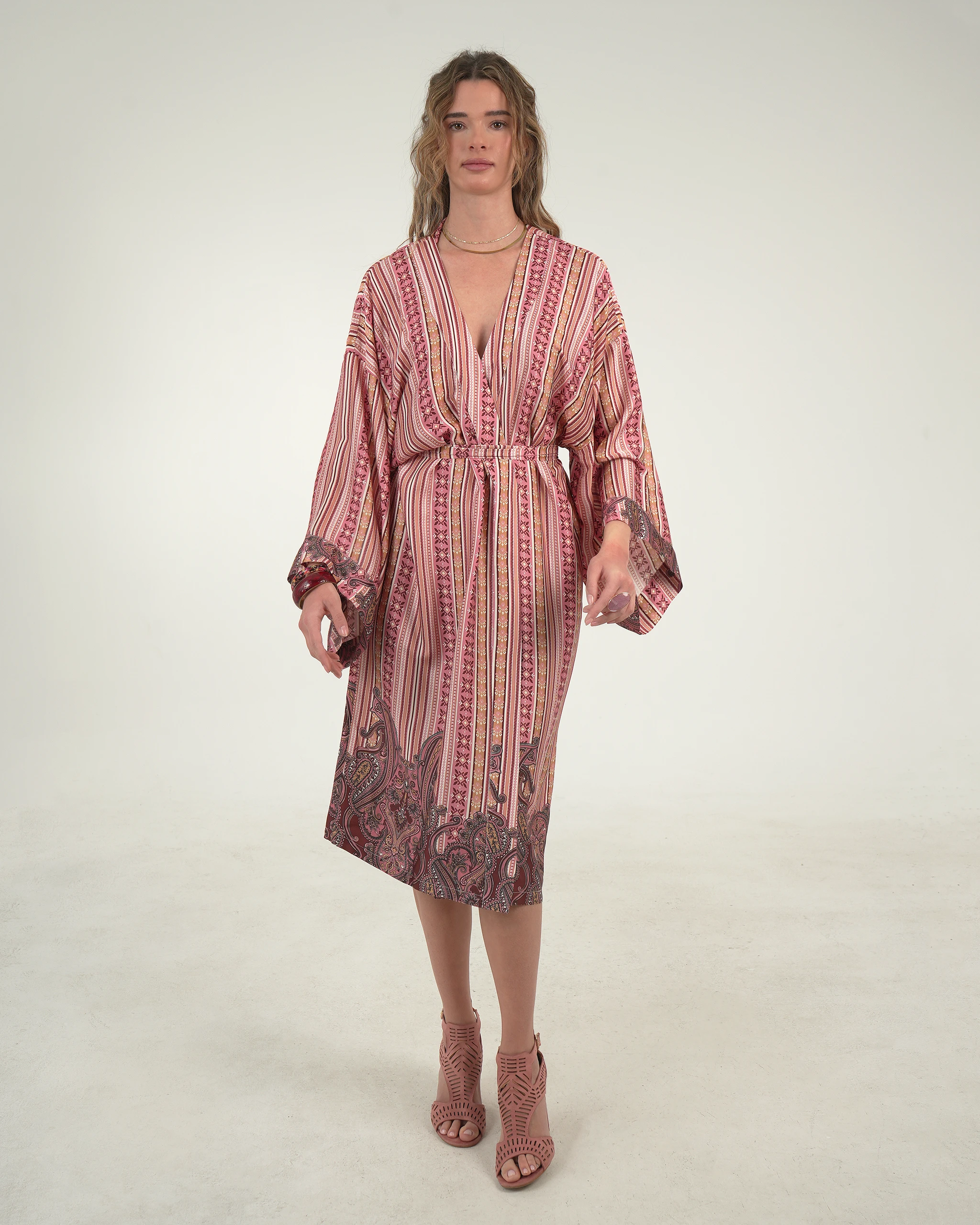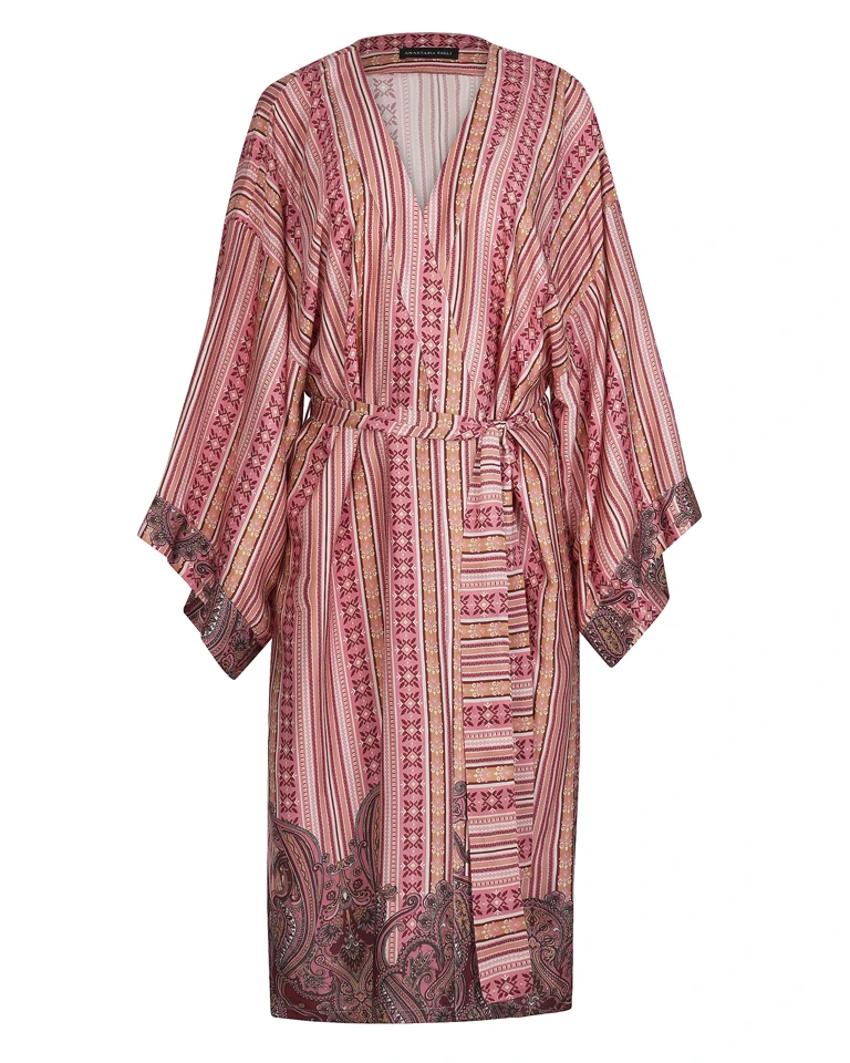 Κιμονό σε ροζ-μπορντό αποχρώσεις με ιδιαίτερο print και ζώνη στη μέση, ιδανικό για elegant layering εμφανίσεις.