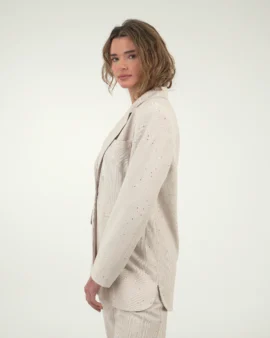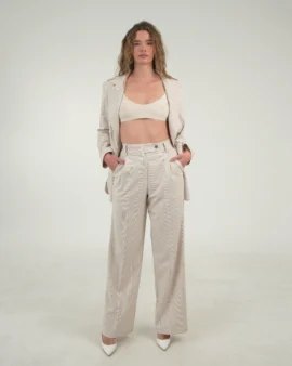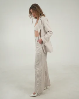 Μπεζ denim παντελόνι με διακριτική χρυσή λεπτομέρεια και εσωτερικό ρυθμιζόμενο λάστιχο στη μέση για άνετη και προσαρμόσιμη εφαρμογή.